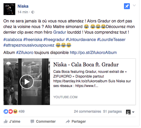 A noter qu’en début de semaine une vidéo faisait irruption sur le net dans laquelle on voyait l’artiste se faire interpeller par la police. En partageant son nouveau clip, Niska a publié des phrases étranges « On ne sera jamais là où vous nous attendez ! Alors Gradur on dort pas chez la voisine nous ? Allo Maitre simonard (…) Vous comprendrez tout ! #calaboca #freeniska #freegradur #Untourdavance #LourdleTeaser #attrapeznoussivouspouvez ». Une façon sans doute de sous entendre que la vidéo de cette interpellation n’était qu’en fait une stratégie de teasing permettant d’annoncer Cala Boca. Le contenu du clip étant cohérent avec le fait de se faire interpeller par les forces de police.