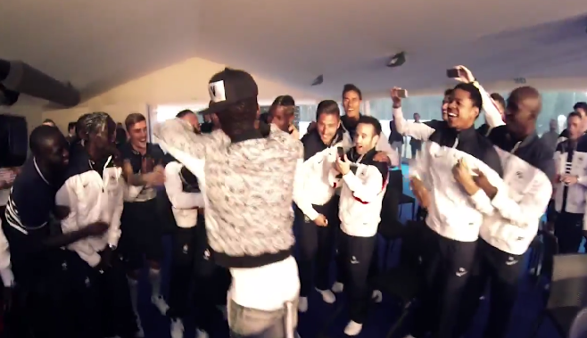 En visite à Clairefontaine, le rappeur de la Sexion D’assaut Black M a interprété son morceau Mme Pavoshko, extrait de son album LES YEUX PLUS GROS QUE LE MONDE, avec les footballeurs de l’équipe de France.